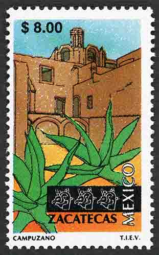No. Scott: 2137 -- Año de Emisión: 1997 -- Valor Facial: N$ 8.00 -- Multicolor -- Perforación: 14 -- Tipo de Impresión: Offset Opaco Timbre Postal Mexicano multicolor, perteneciente a la serie de México Turístico, al fondo de la imagen de observa de forma surrealista algunos edificios y en la parte frontal aparecen dos plantas de hojas triangulares, carnosas con terminación en punta, de nombre maguey, en la parte superior está escrito el valor facial de "N$ 8.00", en la parte inferior "ZACATECAS, MÉXICO" y "CAMPUZANO T.I.E.V.". Para más información favor de dirigirse a biblioteca@mufi.org.mx