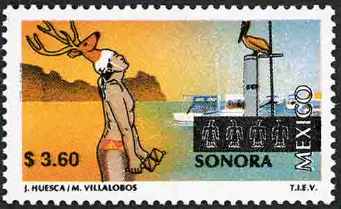 No. Scott: 1971 -- Año de Emisión: 1999 -- Valor Facial: N$ 3.60 -- Multicolor -- Perforación -- Tipo de Impresión: Offset Timbre Postal Mexicano multicolor, perteneciente a la serie de México Turístico, en forma surrealista aparecen dos paisajes, del lado izquierdo hay un personaje semidesnudo, portando un taparrabo, sobre su cabeza, lleva una cabeza disecada de venado con grandes cuernos y una maraca en cada mano, del lado derecho, se observa una imagen acuática, con barcos y un ave, sobre la estampilla está escrito el valor facial de "$ 3.60", "SONORA, MEXICO y "J. HUESCA / M. VILLALOBOS T.I.E.V." Para más información favor de dirigirse a biblioteca@mufi.org.mx