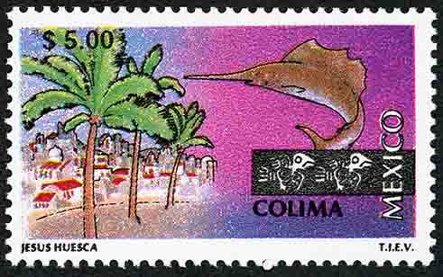 No. Scott: 1976 -- Año de Emisión: 1998 -- Valor Facial: N$ 5.00 -- Multicolor -- Perforación: 14 -- Tipo de Impresión: Offset Opaco Timbre Postal Mexicano multicolor, perteneciente a la serie de México Turístico, del lado izquierdo se observa una área habitacional y tres palmeras al frente, del lado derecho aparece un pez espada de gran tamaño, caracterizado por su pico largo y aplanado, sobre la imagen está escrito el valor facial de "$ 5.00", "COLIMA, MEXICO" y JESÚS HUESCA, T.I.E.V. Para más información favor de dirigirse a biblioteca@mufi.org.mx