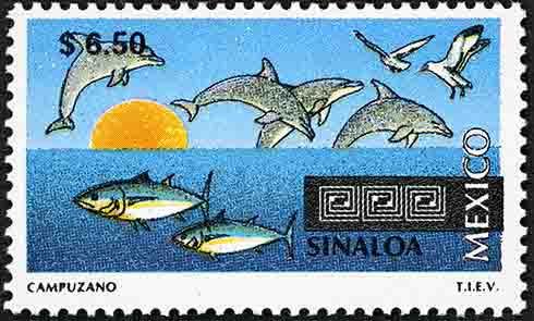 No. Scott: 1978 -- Año de Emisión: 1998 -- Valor Facial: $ 6.50 -- Multicolor -- Perforación: 14 -- Tipo de Impresión: Offset Opaco Timbre Postal Mexicano multicolor, perteneciente a la serie de México Turístico, en forma surrealista, la imagen nos proyecta el cielo, el mar y el sol, en la parte frontal aparecen animales mamíferos marinos, conocidos como delfines y algunas aves en vuelo, en la parte superior aparece escrito el valor facial de "$ 6.50", en la parte inferior "SINALOA, MEXICO" y "CAMPUZANO T.I.E.V.". Para más información favor de dirigirse a biblioteca@mufi.org.mx