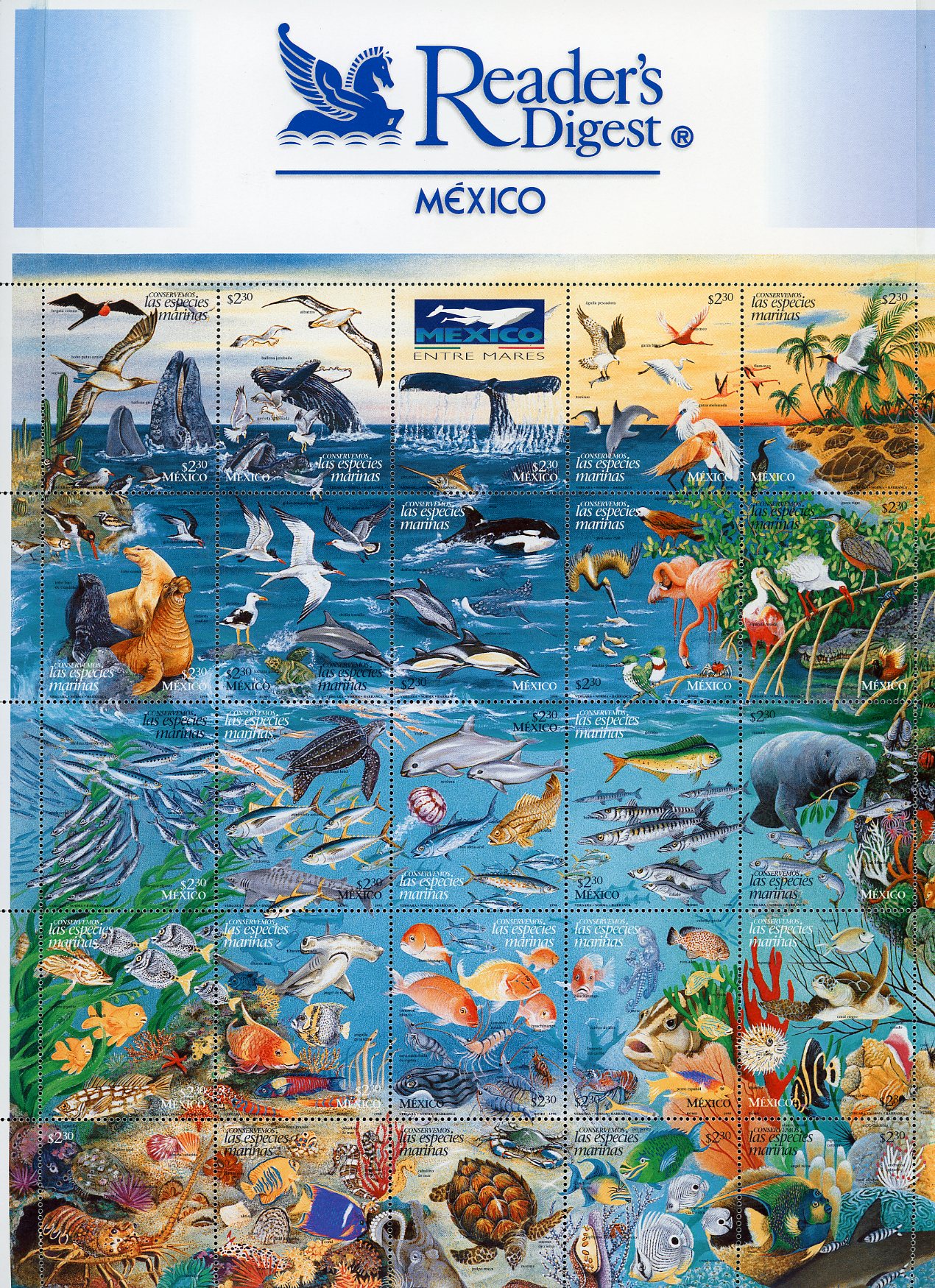 No. Scott: 2090 -- Año de Emisión: 1998 -- Valor Facial: $ 2.30 -- Multicolor -- Perforación: 13 1/2 -- Tipo de Impresión: Offset Fluorescente Planilla multicolor completa con viñeta comercial RD de México, misma que hace alusión a la Conservación de las Especies Marinas en México, en cada timbre aparecen diferentes imagenes de flora y fauna, así como vegetales y animales terrestres y marinos, sobre cada estampilla está escrito "CONSERVEMOS las especies marinas", el valor facial de "$2.30" y "MÉXICO". Para más información favor de dirigirse a biblioteca@mufi.org.mx