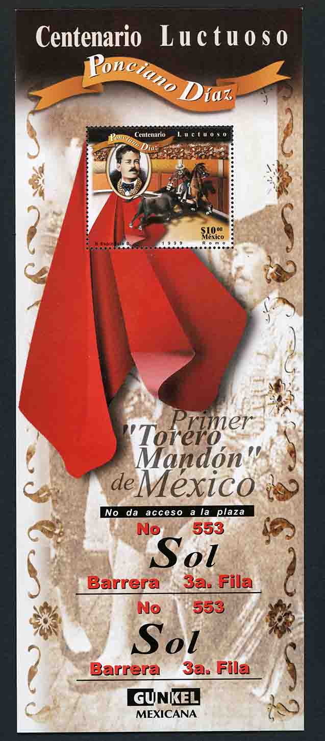 No. Scott: 2144 -- Año de Emisión: 1999 -- Valor Facial: $ 10.00 -- Multicolor -- Tinta de Seguridad UV -- Perforación:13 -- Tipo de Impresión: OffsetHoja Recuerdo de México multicolor, alusivo al centenario luctuoso del torero mexicano Ponciano Díaz Salinas, esta hoja está representada por un boleto de acceso a una plaza de toros, en la parte superior aparece un timbre mostrando en la imagen una corrida de toros, en un óvalo se observa el retrato del torero, un toro, un caballo y algunas gradas con espectadores, abajo del timbre hay un capote de tela en color rojo, sobre la hoja está escrito, "CENTENARIO LUCTUOSO PONCIANO DÍAZ", "Primer Torero Mandpon de México", "No da acceso a la plaza" y "No. 553, Sol, Barrera 3a. Fila".