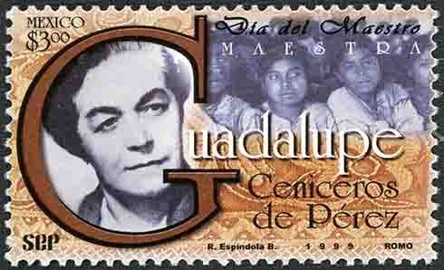 No. Scott: 2145 -- Año de Emisión: 1999 -- Valor Facial: $ 3.00 -- Multicolor -- Perforación:13 1/2 -- Tipo de Impresión: Offset Semimate Timbre Postal Mexicano multicolor, del lado izquierdo aparece el retrato de la profesora Guadalupe Ceniceros de Pérez, del lado derecho y dentro de un rectángulo hay tres niñas indígenas, sobre la estampilla está escrito"MÉXICO", el valor facial de "$3.00", "Día del Maestro MAESTRA", "SEP" y "R. Espíndola, 1999, ROMO". Para más información favor de dirigirse a biblioteca@mufi.org.mx