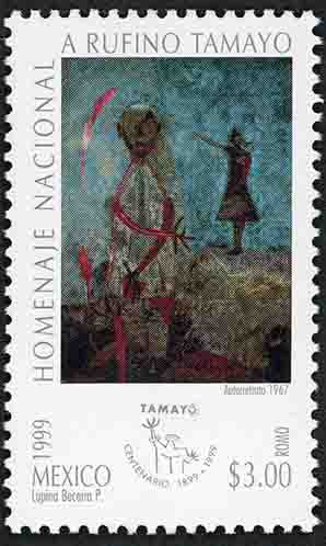 No. Scott: 2157 -- Año de Emisión: 1999 -- Valor Facial: $ 3.00 -- Multicolor -- Perforación:13 1/2 -- Tipo de Impresión: Offset Fluorescente Timbre Postal Mexicano multicolor, en la imagen se observa una obra del pintor y muralista Rufino Tamayo, titulada Autorretrato, en la estampilla está escrito "HOMENAJE NACIONAL A RUFINO TAMAYO", "MÉXICO 1999", el valor facial de "$3.00" y "ROMO". Para más información favor de dirigirse a biblioteca@mufi.org.mx