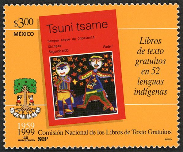 No. Scott: 2156 -- Año de Emisión: 1999 -- Valor Facial: $ 3.00 -- Multicolor -- Perforación:13 1/2 -- Tipo de Impresión: OffsetTimbre Postal Mexicano multicolor, en la imagen aparece la portada de un libro titulado "Tsuni tsame, Lengua zoque de Copainalá, Chiapas, Segundo Ciclo, Part I, en ella aparecen dos figuras humanas con vestimenta prehispánica, sobre la estampilla está escrito el valor facial de "$3.00", "MÉXICO", "Libros de texto gratuitos en 52 lenguas indígenas", "1959-1999" 40 Aniversario", "Comisión Nacional de los Libros de Texto Gratuitos" y "SEP, ROMO".