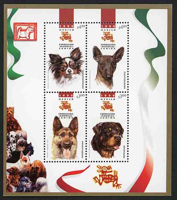 No. Scott: 2149 -- Año de Emisión: 1999 -- Valor Facial: $ 3.00 y $ 4.20 -- Multicolor -- Perforación:13 1/2 -- Tipo de Impresión: Offset FluorescenteHoja Recuerdo de México multicolor, alusiva a la Exposición Mundial Canina México 1999, en la parte central aparecen cuatro timbres postales con animales mamíferos de la familia de los cánidos de tamaño, pelaje y color variable según las razas, las razas que aparecen son: Chihuahua, Xoloitzcuintle, Pastor Alemán y Rottweiler, en cada estampilla está escrito "1999 MÉXICO", "EXPOSICIÓN MUNDIAL CANINA", el valor facial de "$3.00 y "$4.20".
