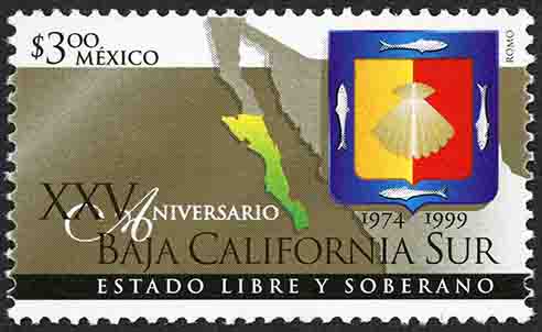 No. Scott: 2162 -- Año de Emisión: 1999 -- Valor Facial: $ 3.00 -- Multicolor -- Perforación:13 -- Tipo de Impresión: Offset Fluorescente Timbre Postal Mexicano multicolor, al fondo de la imagen se observa parte del mapa de Baja California Sur y sobre de éste aparece el escudo del estado, en la parte superior está escrito el valor facial de "$3.00", "MÉXICO" y en la parte inferior"XXV ANIVERSARIO, BAJA CALIFORNIA SUR", "1974-1999", "ESTADO LIBRE Y SOBERANO". Para más información favor de dirigirse a biblioteca@mufi.org.mx