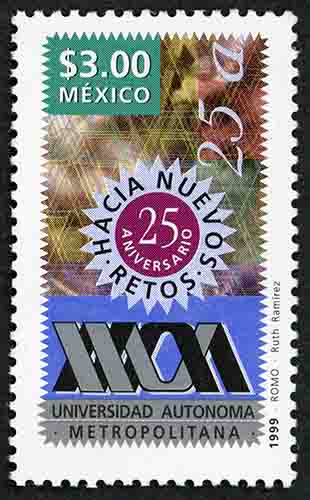 No. Scott: 2170 -- Año de Emisión: 1999 -- Valor Facial: $ 3.00 -- Multicolor -- Perforación:13 1/2 -- Tipo de Impresión: Offset Timbre Postal Mexicano multicolor, en ella aparece un mozaico multicolor brillante, en medio el emblema del 25 Aniversario Hacia Nuevos Retos y en la parte inferior el emblema de la UNIVERSIDAD AUTÓNOMA METROPOLITANA, sobre la estampilla está escrito el valor facial de "$3.00, "MÉXICO" y "1999, ROMO, RUTH RAMÍREZ. Para más información favor de dirigirse a biblioteca@mufi.org.mx