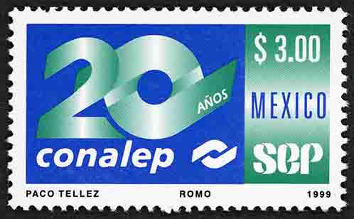 No. Scott: 2175 -- Año de Emisión: 1999 -- Valor Facial: $ 3.00 -- Multicolor -- Perforación:13 1/2 -- Tipo de Impresión: Offset Timbre Postal Mexicano multicolor, en la imagen aparece escrito "20 AÑOS", Conalep y emblema, mismo que está representado por dos elementos simétricos que manifiestan el proceso de enseñanza-aprendizaje, también se observa el valor facial de "$3.00", "MEXICO, SEP" y "PACO TELLEZ, ROMO, 1999". Para más información favor de dirigirse a biblioteca@mufi.org.mx