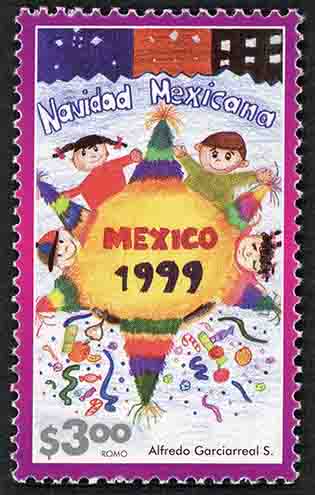 No. Scott: 2173 -- Año de Emisión: 1999 -- Valor Facial: $ 3.00 -- Multicolor -- Perforación:13 1/2 -- Tipo de Impresión: Offset Timbre Postal Mexicano multicolor, la imagen muestra una ilustración infantil, arriba aparecen adornos de papel picado, en el centro hay una piñata multicolor con seis picos, alrededor de esta, hay cuatro niños y abajo una variedad de frutas y dulces, sobre la estampilla está escrito "Navidad Mexicana", "MÉXICO 1999", el valor facial de "$3.00" y "Alfredo Garciareal S., ROMO".