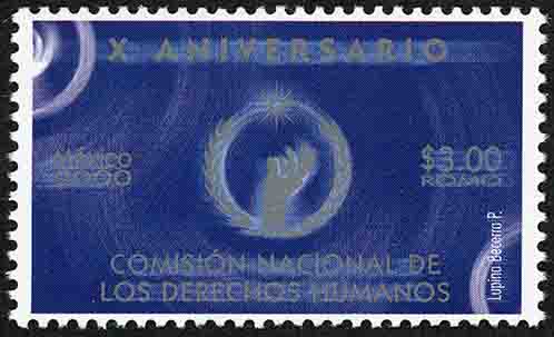 No. Scott: 2209 -- Año de Emisión: 2000 -- Valor Facial: $ 3.00 -- Multicolor -- Perforación:13 1/2 -- Tipo de Impresión: Offset Fluorescente Timbre Postal Mexicano en color azul, en el centro de la imagen se observa una corona de laurel y dentro de ella una mano humana como queriendo alcanzar y sujetar algo, sobre la estampilla está escrito "X ANIVERSARIO", "MÉXICO 2000", el valor facial de "$3.00", ROMO" y "COMISIÓN NACIONAL DE LOS DERECHOS HUMANOS". Para más información favor de dirigirse a biblioteca@mufi.org.mx