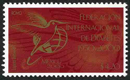 No. Scott: 2211 -- Año de Emisión: 2000 -- Valor Facial: $ 4.20 -- Multicolor -- Perforación:13 1/2 x 13 -- Tipo de Impresión: Offset Timbre Postal Mexicano en colores guinda y oro, al fondo de la imagen aparece un globo terráqueo y en primer planpo hay un ave pequeña, con pico muy fino como una ahuja y alas de gran tamaño, sobre la estampilla está escrito "ROMO", "FEDERACIÓN INTERNACIONAL DE DIABETES 1950-2000", "MÉXICO 2000" y el valor facial de "$4.20". Para más información favor de dirigirse a biblioteca@mufi.org.mx