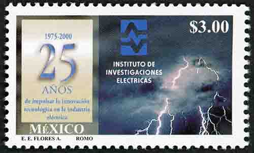 No. Scott: 2214 -- Año de Emisión: 2000 -- Valor Facial: $ 3.00 -- Multicolor -- Perforación:13 1/2 -- Tipo de Impresión: Offset Timbre Postal Mexicnano multicolor, del lado izquierdo aparece escrito dentro de un rectángulo "1975-2000 25 AÑOS", "MÉXICO", del lado derecho se aprecia el logotipo del INSTITUTO DE INVESTIGACIONES ELÉCTRICAS", el valor facial de "43.00" y la representación de un rayo en el cielo. Para más información favor de dirigirse a biblioteca@mufi.org.mx