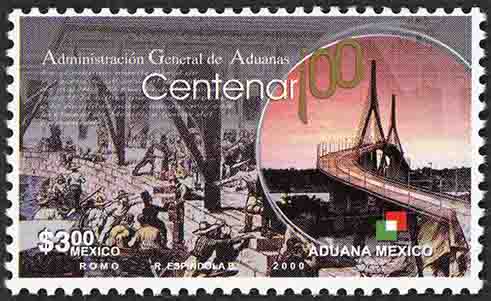 No. Scott: 2215 -- Año de Emisión: 2000 -- Valor Facial: $ 3.00 -- Multicolor -- Perforación:13 1/2 -- Tipo de Impresión: Offset Timbre Postal Mexicano multicolor, del lado izquierdo de la ilustración aparece un gran número de personas, divididos por un muro de construcción, unas están arriba y otras abajo dentro de un área de agua, del lado derecho y dentro de un círculo, se observa un gran puente carretero que atraviesa parte de una ciudad, en la estampilla está escrito "Administración General de Aduanas", "Centenar 100", el valor facial de "$3.00", "MÉXICO", "ADUANA MÉXICO" y "ROMO, R. ESPÍNDOLA, 2000". Para más información favor de dirigirse a biblioteca@mufi.org.mx