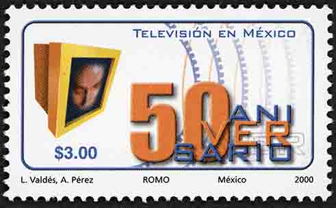 No. Scott: 2218 -- Año de Emisión: 2000 -- Valor Facial: $ 3.00 -- Multicolor -- Perforación:13 1/2 -- Tipo de Impresión: Offset Timbre Postal Mexicano multicolor, del lado izquierdo aparece en forma surrealista, un televisor y en la pantalla se observa una cara humana, del lado derecho está escrito "TELEVISIÓN EN MÉXICO", "50 ANIVERSARIO", el valor facial de "$3.00" y "L. Valdés A. Pérez, ROMO, MÉXICO, 2000". Para más información favor de dirigirse a biblioteca@mufi.org.mx