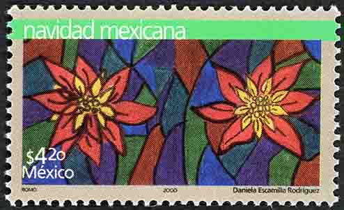 No. Scott: 2217 -- Año de Emisión: 2000 -- Valor Facial: $ 4.20 -- Multicolor -- Perforación:13 1/2 -- Tipo de Impresión: Offset Timbre Postal Mexicano multicolor, al fondo de la imagen aparece un mozaico multicolor de diferentes formas y figuras, al frente haya dos flores en forma de estrellas, conocidas como flor de nochebuena, flor de navidad y flor de pascua, sobre la estampilla está escrito "navidad mexicana", el valor facial de "$4.20", "México" y "ROMO, 2000, Daniela Escailla Rodríguez". Para más información favor de dirigirse a biblioteca@mufi.org.mx