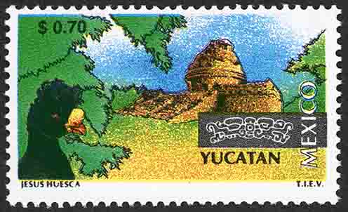 No. Scott: 2120 -- Año de Emisión: 1999 -- Valor Facial: $0 .70 -- Multicolor -- Perforación: 14 -- Tipo de Impresión: Offset Litografiado Timbre Postal Mexicano multicolor, perteneciente a la serie de México Turístico, en forma surrealista, en la imagen aparece un complejo de ruinas, gran vegetación alrededor de éstas y al frente un ave de color negro y pico amarillo, sobre la estampilla está escrito el valor facial de "$ 0.70", "YUCATÁN, MÉXICO" y "JESÚS HUESCA, T.I.E.V.". Para más información favor de dirigirse a biblioteca@mufi.org.mx