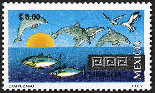 No. Scott: 2133 -- Año de Emisión: 1999 -- Valor Facial: $ 6.00 -- Multicolor -- Perforación: 14 -- Tipo de Impresión: Offset Litografiado Timbre Postal Mexicano multicolor, perteneciente a la serie de México Turístico, en forma surrealista, la imagen nos proyecta el cielo, el mar y el sol, en la parte frontal aparecen animales mamíferos marinos, conocidos como delfines y algunas aves en vuelo, en la parte superior aparece escrito el valor facial de "$ 6.00", en la parte inferior "SINALOA, MEXICO" y "CAMPUZANO T.I.E.V.". Para más información favor de dirigirse a biblioteca@mufi.org.mx