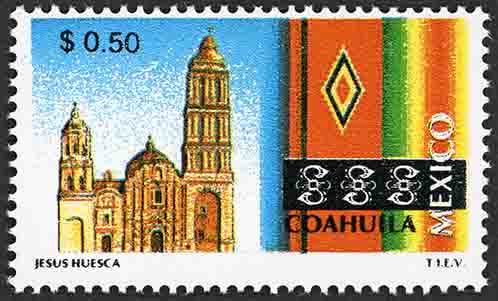 No. Scott: 2119 -- Año de Emisión: 1999 -- Valor Facial: $ 0.50 -- Multicolor -- Perforación: 14 -- Tipo de Impresión: Offset Litografiado Timbre Postal Mexicano multicolor, perteneciente a la serie de México Turístico, del lado izquierdo de la imagen aparece la fachada de la catedral de Saltillo y del lado derecho se aprecia un textil artesanal de varios colores, sobre la estampilla está escrito el valor facial de "$ 0.50", "COAHUILA MÉXICO" y "JESÚS HUESCA T.I.E.V.". Para más información favor de dirigirse a biblioteca@mufi.org.mx