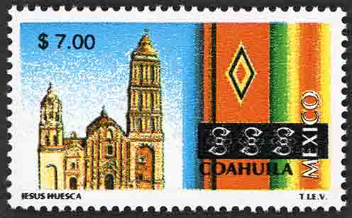 No. Scott: 2136 -- Año de Emisión: 1999 -- Valor Facial: $ 7.00 -- Multicolor -- Perforación: 14 -- Tipo de Impresión: Offset Litografiado Timbre Postal Mexicano multicolor, perteneciente a la serie de México Turístico, del lado izquierdo de la imagen aparece la fachada de la catedral de Saltillo y del lado derecho se aprecia un textil artesanal de varios colores, sobre la estampilla está escrito el valor facial de "$ 7.00", "COAHUILA MÉXICO" y "JESÚS HUESCA T.I.E.V.". Para más información favor de dirigirse a biblioteca@mufi.org.mx