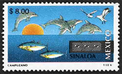 No. Scott: 2138 -- Año de Emisión: 1999 -- Valor Facial: $ 8.00 -- Multicolor -- Perforación: 14 -- Tipo de Impresión: Offset Litografiado Timbre Postal Mexicano multicolor, perteneciente a la serie de México Turístico, en forma surrealista, la imagen nos proyecta el cielo, el mar y el sol, en la parte frontal aparecen animales mamíferos marinos, conocidos como delfines y algunas aves en vuelo, en la parte superior aparece escrito el valor facial de "$ 8.00", en la parte inferior "SINALOA, MEXICO" y "CAMPUZANO T.I.E.V.". Para más información favor de dirigirse a biblioteca@mufi.org.mx