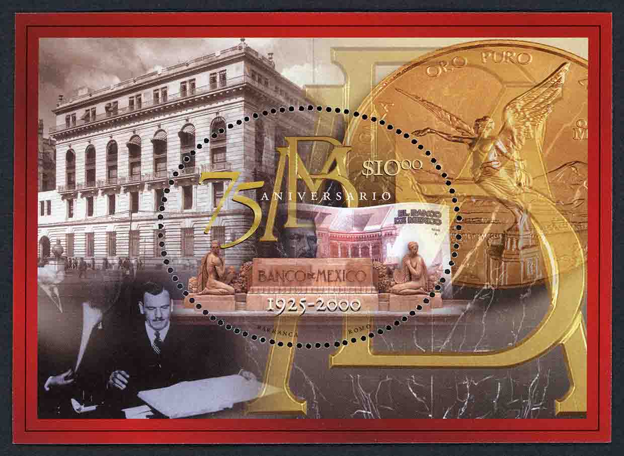 No. Scott: 2201 -- Año de Emisión: 2000 -- Valor Facial: $ 10.00 -- Multicolor -- Perforación:13 1/2 -- Tipo de Impresión: Offset Hoja Recuerdo multicolor de México, alusiva al 75 Aniversario del Banco de México, en ella parece la fachada de un edificio, una moneda en relieve y el personaje mexicano Plutarco Elías Calles, en la parte central se observa un timbre postal y en él está escrito "75 ANIVERSARIO DEL BANCO DE MÉXICO", el valor facial de "$10.00", "1925-2000" y "BARRANCA, ROMO". Para más información favor de dirigirse a biblioteca@mufi.org.mx