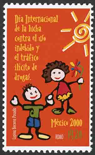 No. Scott: 2189 -- Año de Emisión: 2000 -- Valor Facial: $ 4.20 -- Multicolor -- Perforación: 13 1/2 -- Tipo de Impresión: Offset FluorescenteTimbre Postal Mexicano multicolor, la imagen muestra una ilustración infantil en la cual aparece una niña y un niño, tomados de la mano, la niña sostiene una flor con una mano, en la parte superior aparece la imagen de un sol en forma de espiral y con lineas rectas alrededor, sobre la estampilla está escrito "Día Internacional de la lucha contra el uso indebido y el tráfico ilícito de drogas, "MÉXICO 2000", el valor facial de "$4.20" y "Lupina Becerra Posada, ROMO".