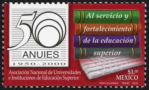 No. Scott: 2182 -- Año de Emisión: 2000 -- Valor Facial: $ 3.00 -- Multicolor -- Perforación: 13 1/2 -- Tipo de Impresión: Offset LitografiadoTimbre Postal Mexicano multicolor, del lado izquierdo y sobre un fondo a rayas está escrito "50 ANUIES 1950-2000", del lado derecho y en una ilustración surrealista aparecen cuatro libros apilados, al final de ellos hay un teclado de computadora, sobre los libros se leé "Al servicio y fortalecimiento de la educación superior", en laparte inferior está escrito "Asociación Nacional de Universidades e Instituciones de Educación Superior", el valor facial de "$3.00", "MÉXICO" y "RONI ZAJDMAN, ROMO, 2000".
