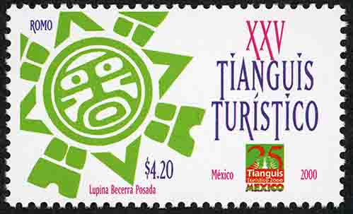 No. Scott: 2183 -- Año de Emisión: 2000 -- Valor Facial: $ 4.20 -- Multicolor -- Perforación: 13 1/2 -- Tipo de Impresión: Offset Timbre Postal Mexicano multicolor, del lado izquierdo aparece la imagen de un sol prehispánico, del lado derecho está escrito "XXV TIANGUIS TURÍSTICO" y el emblema del mismo, en la parte inferior aparece escrito el valor facial de "$4.20", "MÉXICO 2000" y "LUPINA BECERRA POSADA". Para más información favor de dirigirse a biblioteca@mufi.org.mx