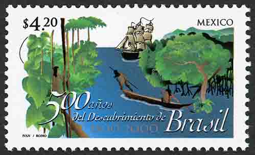 No. Scott: 2184 -- Año de Emisión: 2000 -- Valor Facial: $ 4.20 -- Multicolor -- Perforación: 13 -- Tipo de Impresión: Offset Timbre Postal Mexicano multicolor, al fondo de la imagen se observa un barco de gran tamaño, en la parte de en medio una gran extensión de agua, reodeada de mucha vegetación, al frente aparece una balsa con dos siluetas humanas sobre de ella y una silueta más del lado izquierdo, al parecer está parado sobre un tronco y sosteniéndose de unas ramas de árbol, sobre la estampilla está escrito el valor facial de "$4.20", "MÉXICO", "500 Años del Descubrimiento de Brasil" e "IVAN, ROMO". Para más información favor de dirigirse a biblioteca@mufi.org.mx