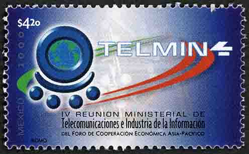 No. Scott: 2188 -- Año de Emisión: 2000 -- Valor Facial: $ 4.20 -- Multicolor -- Perforación: 13 1/2 -- Tipo de Impresión: OffsetTimbre Postal Mexicano multicolor, en la imagen se observa el logotipo de TELMIN (Telecomunicaciones e Industria de la Información) representada por un contorno circular, en el centro aparece un mapamundi, en medio hay una línea curva y abajo cuatro círculos pequeños, sobre la estampilla está escrito el valor facial de "$4.20", "MÉXICO 2000", "IV REUNIÓN MINISTERIAL DE Telecomunicaciones e Industria de la Información" y "DEL FORO DE COOPERACIÓN ECONÓMICA ASIA-PACÍFICA".