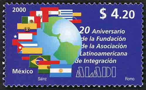 No. Scott: 2198 -- Año de Emisión: 2000 -- Valor Facial: $ 4.20 -- Multicolor -- Perforación:13 1/2 x 13 1/4-- Tipo de Impresión: Offset LitografiadoTimbre Postal Mexicano multicolor, en la imagen aparece un globo mapamundi, mostrando al continente Americano y alrededor se observan banderas de los países de América Latina, sobre la estampilla está escrito "2000", el valor facial de "$4.20", "20 Aniversario de la Fundación de la Asociación Latinoamericana de Integración ALADI", "MÉXICO" y "SAINZ ROMO".