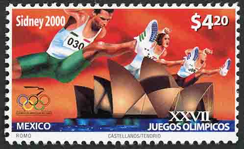 No. Scott: 2203 -- Año de Emisión: 2000 -- Valor Facial: $ 4.20 -- Multicolor -- Perforación:13 1/2 -- Tipo de Impresión: Offset Timbre Postal Mexicano multicolor, en la imagen se observan a tres jóvenes saltando obstáculos, ellos están vestidos con ropa deportiva, en los pies llevan puestos tenis deportivos, del lado izquierdo aparece el símbolo de los Juegos Olímpicos, sobre la estampilla está escrito "Sidney 2000", el valor facial de "$4.20", "MÉXICO", "XXVII JUEGOS OLÍMPICOS" y "ROMO, CASTELLANOS TENORIO". Para más información favor de dirigirse a biblioteca@mufi.org.mx