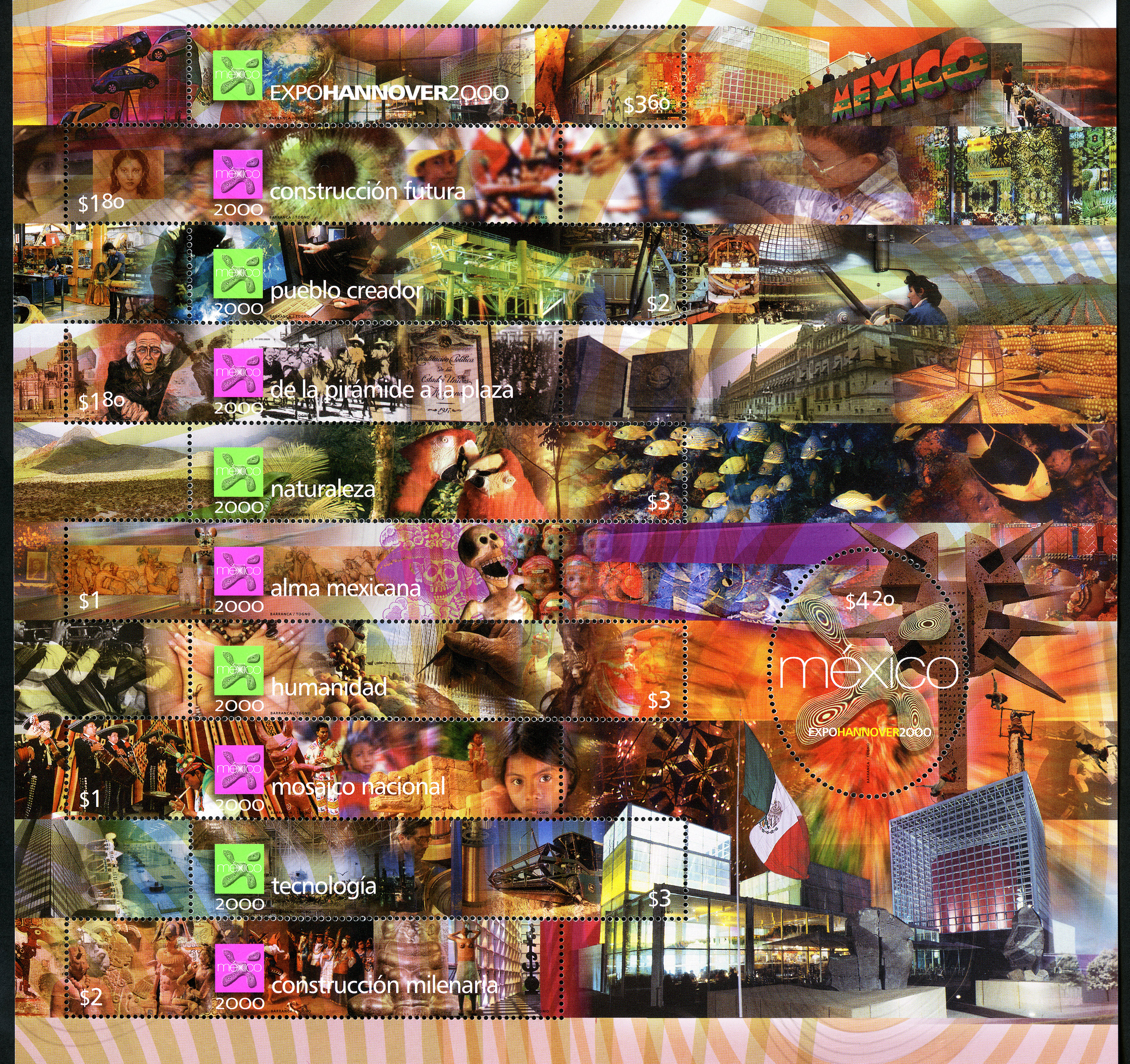 No. Scott: 2200 -- Año de Emisión: 2000 -- Valor Facial: $ 26.40 -- Multicolor -- Perforación:13 1/2 -- Tipo de Impresión: Offset LitografiadoHoja Recuerdo multicolor de México, en ella se observa un mozaico multicolor de diferentes imágenes de México, dentro de los cuales resaltan diferentes timbres postales con los temas de Expo Hannover 2000, Construcción Futura, Pueblo Creador, De la Pirámide a la Plaza, Naturaleza, Alma Mexicana, Humanidad, Mozaico Natural, Tecnología, Construcción Milenaria y México, en cada estampilla está escrito el valor facial y "MÉXICO 2000".