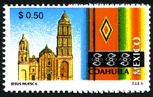 No. Scott: 2119 -- Año de Emisión: 1999 -- Valor Facial: $ 0.50 -- Multicolor -- Perforación: 14 -- Tipo de Impresión: Offset Litografiado Timbre Postal Mexicano multicolor, perteneciente a la serie de México Turístico, del lado izquierdo de la imagen aparece la fachada de la catedral de Saltillo y del lado derecho se aprecia un textil artesanal de varios colores, sobre la estampilla está escrito el valor facial de "$ 0.50", "COAHUILA MÉXICO" y "JESÚS HUESCA T.I.E.V.". Para más información favor de dirigirse a biblioteca@mufi.org.mx