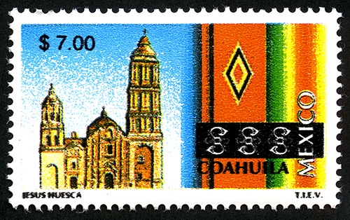 No. Scott: 2136 -- Año de Emisión: 1999 -- Valor Facial: $ 7.00 -- Multicolor -- Perforación: 14 -- Tipo de Impresión: Offset Litografiado Timbre Postal Mexicano multicolor, perteneciente a la serie de México Turístico, del lado izquierdo de la imagen aparece la fachada de la catedral de Saltillo y del lado derecho se aprecia un textil artesanal de varios colores, sobre la estampilla está escrito el valor facial de "$ 7.00", "COAHUILA MÉXICO" y "JESÚS HUESCA T.I.E.V.". Para más información favor de dirigirse a biblioteca@mufi.org.mx