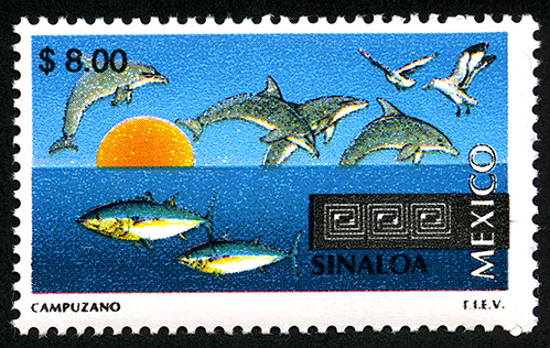 No. Scott: 2138 -- Año de Emisión: 1999 -- Valor Facial: $ 8.00 -- Multicolor -- Perforación: 14 -- Tipo de Impresión: Offset Litografiado Timbre Postal Mexicano multicolor, perteneciente a la serie de México Turístico, en forma surrealista, la imagen nos proyecta el cielo, el mar y el sol, en la parte frontal aparecen animales mamíferos marinos, conocidos como delfines y algunas aves en vuelo, en la parte superior aparece escrito el valor facial de "$ 8.00", en la parte inferior "SINALOA, MEXICO" y "CAMPUZANO T.I.E.V.". Para más información favor de dirigirse a biblioteca@mufi.org.mx