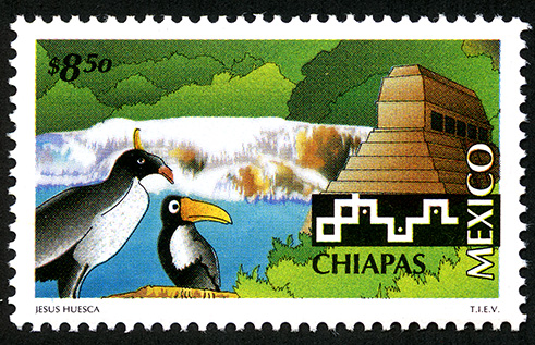 No. Scott: 2139A -- Año de Emisión: 1999 -- Valor Facial: $ 8.50 -- Multicolor -- Perforación: 14 -- Tipo de Impresión: Offset Litografiado Timbre Postal Mexicano multicolor, perteneciente a la serie de México Turístico, en forma surrealista y al fondo de la imagen aparece un área verde de vegetación, adelante, se observan unas cascadas de agua, del lado derecho hay un sitio arqueológico y en primer plano se muestran dos aves de pico muy desarrollado y de colores vivos, de nombre Tucán, arriba aparece escrito el valor facial de "$ 8.50", abajo "CHIAPAS MÉXICO" y "JESÚS HUESCA, T.I.E.V.". Para más información favor de dirigirse a biblioteca@mufi.org.mx