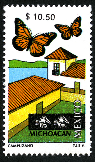 No. Scott: 2141B -- Año de Emisión: 1999 -- Valor Facial: $ 10.50 -- Multicolor -- Perforación: 14 -- Tipo de Impresión: Offset Litografiado Timbre Postal Mexicano multicolor, perteneciente a la serie de México Turístico, al fondo de la imagen aparece un área verde y otra de agua, en primer plano se observan dos casas con techos de tejas, sobre de estas, hay dos mariposas volando, en la parte superior está escrito el valor facial de "$ 10.50", en la parte inferior "MICHOACÁN, MÉXICO" y "CAMPUZANO T.I.E.V.". Para más información favor de dirigirse a biblioteca@mufi.org.mx