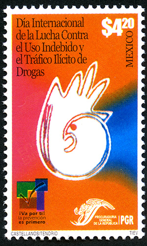 No. Scott: 2229 -- Año de Emisión: 2001 -- Valor Facial: $ 4.20 -- Multicolor -- Perforación: 14 -- Tipo de Impresión: Offset Timbre Postal Mexicano Multicolor, sobre un mozaico multicolor se aprecia el símbolo de una paloma, la cual aparece envueltra entre sus alas, en la parte superior está escrito "Día Internacional de la Lucha Contra el Uso Indebido y el Tráfico Ilícito de Drogas", el valor facial de "$4.20", "MÉXICO" en la parte inferior se observan los símbolos de ¡Va por tí !la prevención es primero y de la PGR. Para más información favor de dirigirse a biblioteca@mufi.org.mx