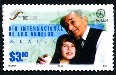 No. Scott: 2238 -- Año de Emisión: 2001 -- Valor Facial: $ 3.00 -- Multicolor -- Perforación: 14 -- Tipo de Impresión: Offset Timbre Postal Mexicano multicolor, en la imagen aparece un hombre de la tercera edad abrazando a una niña, él viste camisa blanca con chaleco color negro, cabello blanco, la niña tiene el cabello largo color negro, ambos están sonriendo, se ven felices, en la parte superior se observan los escudos de la SECRETARÍA DE DESARROLLO SOCIAL y del INAPLEN, sobre la estampilla está escrito "DÍA INTERNACIONAL DE LOS ABUELOS", "MÉXICO", el valor facial de "$3.00" y "TENORIO, 2001, TIEV". Para más información favor de dirigirse a biblioteca@mufi.org.mx