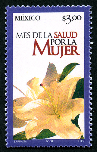 No. Scott: 2241 -- Año de Emisión: 2001 -- Valor Facial: $ 3.00 -- Multicolor -- Perforación: 14 -- Tipo de Impresión: Offset Timbre Postal Mexicano multicolor, en la imagen se observan dos flores hermosas, con pétalos grandes y frondosos en color blanco y hojas color verde, en la parte superior está escrito "MÉXICO", el valor facial de "$3.00" y "MES DE LA SALUD POR LA MUJER", en la parte inferior "ZARRAGA, 2001 Y TIEV". Para más información favor de dirigirse a biblioteca@mufi.org.mx