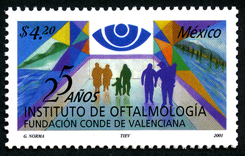 No. Scott: 2242 -- Año de Emisión: 2001 -- Valor Facial: $ 4.20 -- Multicolor -- Perforación: 14 -- Tipo de Impresión: OffsetTimbre Postal Mexicano multicolor, en medio y al fondo de la imagen aparece un ojo humano representado por un pequeño círculo y dos líneas curvas, a los lados se observa un paisaje con montañas, poca vegetación y gran cantidad de agua, en primer plano y dentro de un área delimitada, aperecen siluetas humanas en mi apreciación corresponden a personas adultas y niños, sobre la estampilla está escrito el valor facial de "$4.20", "MÉXICO", "25 AÑOS INSTITUTO DE OFTALMOLOGÍA FUNDACIÓN CONDE DE VALENCIANA" y "G. NORMA, TIEV, 2001".