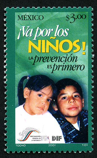 No. Scott: 2248 -- Año de Emisión: 2001 -- Valor Facial: $ 3.00 -- Multicolor -- Perforación: 14 -- Tipo de Impresión: Offset Timbre Postal Mexicano multicolor, en la imagen aparecen una niña y un niño, la niña tiene el cabello recogido con una coleta y fleco en la frente, trae puesta una blusa blanca, el niño tiene el cabello corto y trae puesto un sueter estampado en tonos color azul cou cuello blanco, encima de la playera de la niña aparece aparecen los logotipos de la PROCURADURÍA GENERAL DE LA REPÚBLICA Y DEL DIF, sobre la estampilla está escrito "MÉXICO", "$3.00", ¡Va por los Niños!", "La prevención es primero" y "TOGNO, 2001, TIEV". Para más información favor de dirigirse a biblioteca@mufi.org.mx