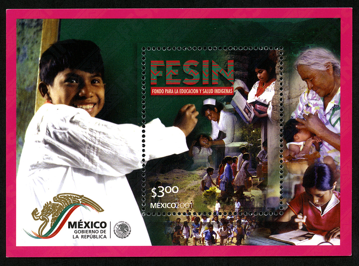 No. Scott: 2246 -- Año de Emisión: 2001 -- Valor Facial: $ 3.00 -- Multicolor -- Perforación: 14 -- Tipo de Impresión: OffsetHoja Recuerdo multicolor de México, alusiva al Fondo para la Educación y Salud Indígena, al fondo aparece un paisaje en una comunidad indígena con un gran número de personas realizando diferentes actividades, en primer plano y del lado izquierdo se observa a un niño sonriendo, cabello un poco largo, vistiendo una camisa en color blanco, del lado derecho hay una señora de la tercera edad, cargando a un niño muy pequeño, abajo de esa imagen aparece una niña sentada con un libro abierto sobre una mesa y sujetando un lapiz con una mano, sobre la estampilla está escrito "FESIN FONDO PARA LA EDUCACIÓN Y SALUD INDÍGENAS", "$3.00" y "MÉXICO 2001".