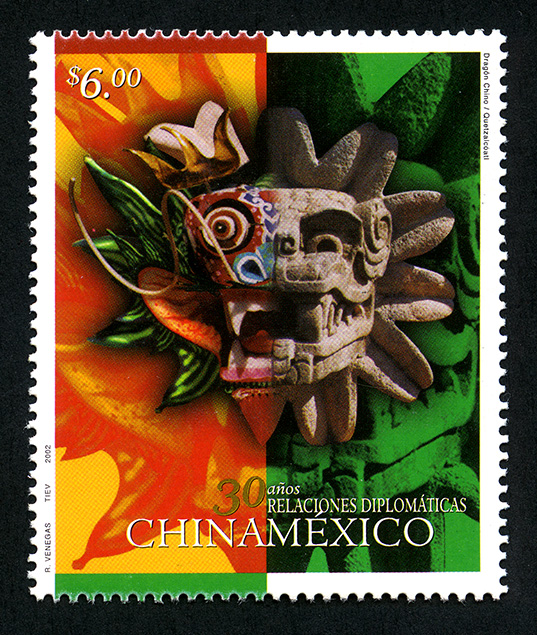 No. Scott: 2252 A -- Año de Emisión: 2002 -- Valor Facial: $ 6.00 -- Multicolor -- Perforación: 14 -- Tipo de Impresión: Offset Timbre Postal Mexicano multicolor, en la imagen aparece del lado izquierdo de la imagen aparece parte de la máscara del Dragón Chino y del lado derecho y del lado derecho de máscara de Quetzalcoátl, sobre la estampilla está escrito el valor facial de "$6.00", "30 años RELACIONES DIPLÓMATICAS CHINA-MÉXICO" y "R. VENEGAS, TIEV, 2002". Para más información favor de dirigirse a biblioteca@mufi.org.mx