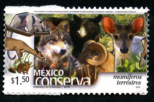 No. Scott: 2256 -- Año de Emisión: 2002 -- Valor Facial: $ 1.50 -- Multicolor -- Perforación: 14 -- Tipo de Impresión: Offset Timbre Postal multicolor perteneciente a la colección de México Conserva, en ella aparece un gran número de animales mamíferos como el oso, lobo, perro, ardilla, borrego cimarrón y lobo, sobre la estampilla está escrito el valor facial de "$1.50", "MÉXICO mamíferos terrestres" y "FERNÁNDEZ DE LA REGUERA / MITRE / TIEV". Para más información favor de dirigirse a biblioteca@mufi.org.mx