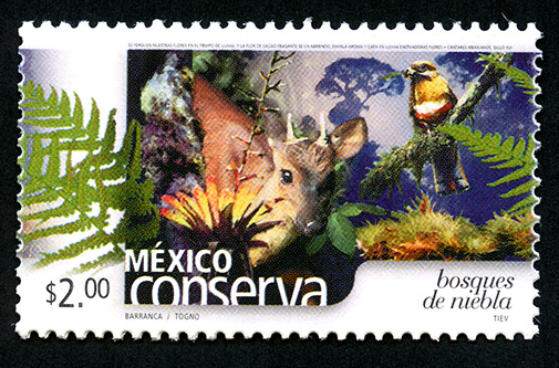 No. Scott: 2257 -- Año de Emisión: 2002 -- Valor Facial: $ 2.00 -- Multicolor -- Perforación: 14 -- Tipo de Impresión: Offset Timbre Postal multicolor perteneciente a la colección de México Conserva, en la imagen aparece un bosque nublado, con selva húmeda y montañoso, tambión aparecen se observa a un ave y a un animal mamífero, sobre la estampilla está escrito el valor facial de "$2.00", "MÉXICO bosques de niebla" y "FERNÁNDEZ DE LA REGUERA / MITRE / TIEV". Para más información favor de dirigirse a biblioteca@mufi.org.mx