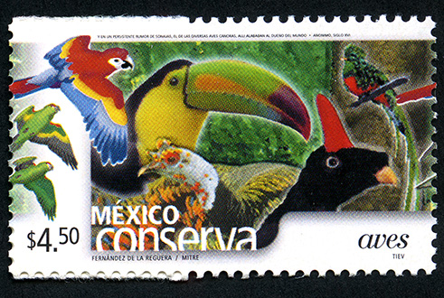 No. Scott: 2259 -- Año de Emisión: 2002 -- Valor Facial: $ 4.50 -- Multicolor -- Perforación: 14 -- Tipo de Impresión: Offset Timbre Postal multicolor perteneciente a la colección de México Conserva, en la imagen aparece una gran diversidad de aves de diferentes colores, formas y tamaños, sobre la estampilla está escrito el valor facial de "$4.50", "MÉXICO aves" y "FERNÁNDEZ DE LA REGUERA / MITRE / TIEV". Para más información favor de dirigirse a biblioteca@mufi.org.mx