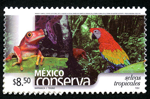 No. Scott: 2265 -- Año de Emisión: 2002 -- Valor Facial: $ 8.50 -- Multicolor -- Perforación: 14 -- Tipo de Impresión: Offset Para más información favor de dirigirse a biblioteca@mufi.org.mx Timbre Postal multicolor perteneciente a la colección de México Conserva, en la imagen se observa un bosque muy denso, con gran diversidad biológica y vegetaciónd de hojas anchas, también aparece parte de la fauna que habita en él, sobre la estampilla está escrito el valor facial de "$8.50", "MÉXICO selvas tropicales" y "FERNÁNDEZ DE LA REGUERA / MITRE / TIEV".